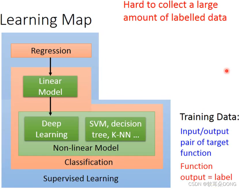 除了 Deep Learning 以外,還有很多其他的 Machine Learning 的Model,它也是 Non-Linear 的 Model。這學期會請吴培元老师幫我們講 SVM,剛才我們講的都是 Supervised Learning 。 Supervised Learning 類的問題是,我們需要大量的 Training Data,這些 Training Data 告訴我們說,一個我們要找的 Function,它的 Input 和 Output 之間有甚麼樣的關係。這個 Function 的 Output,我們常叫做 Label,所以常常聽到說做機器學習需要大量的 Label,指的就是說,如果我們用的是 Supervised 的技術,我們是要讓機器在 Supervised Learning 的这种情境下去學習,我們需要告訴機器,Function的Input和Output是甚麼。這個Output往往沒辦法用很自然的方式取得,我們必須要憑著人工的力量,把它标注出來。這些Function的Output叫做Label,那你要找到這樣的Label,往往需要很大量的Effort(努力)。