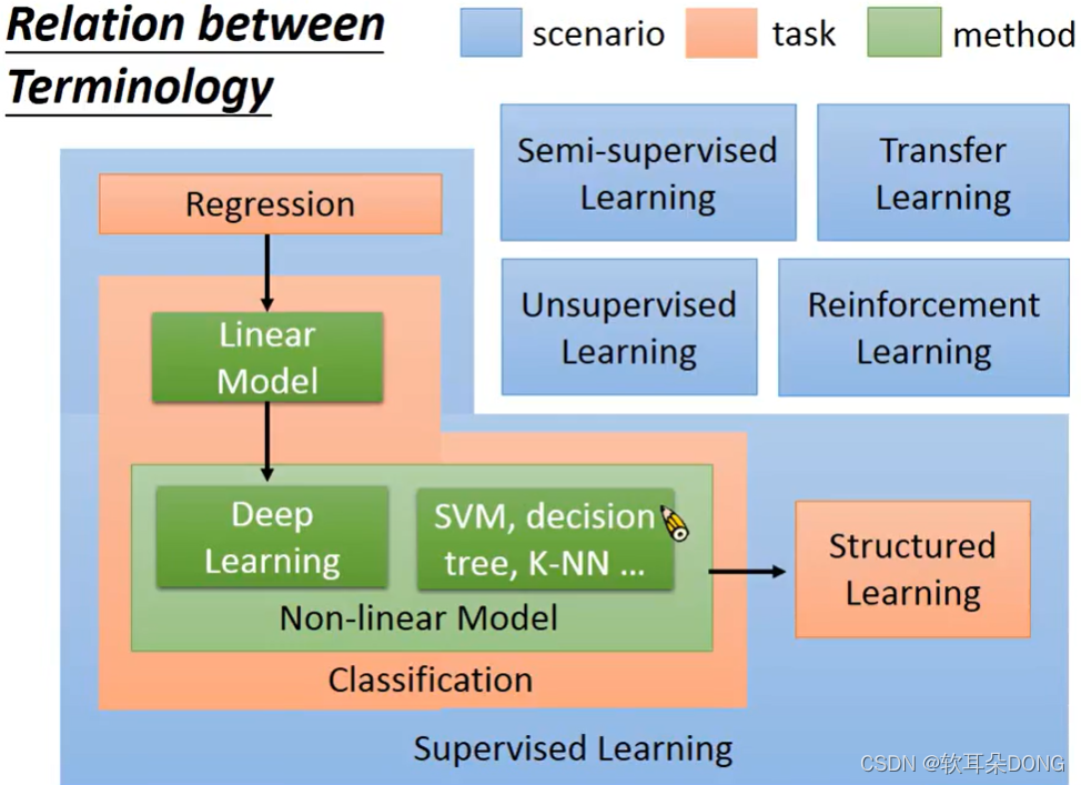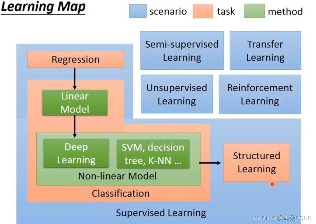 最後在這些 Task 裡面都有不同的 Model,或者是不同的方法,這邊用綠色的方塊表示。他這邊的意思是說,同樣的Task,我們用不同的方法來解它。所以今天 Supervised Learning 它畫得比較大塊,這個裡面的東西在這四個Task裡面也都有出現。Classification畫得比較大塊,它裡面綠色的這些Box,在這些紅色的Box裡面都有出現。希望大家可以了解這些 Machine Learning 不同的技術他們之間的關聯性。