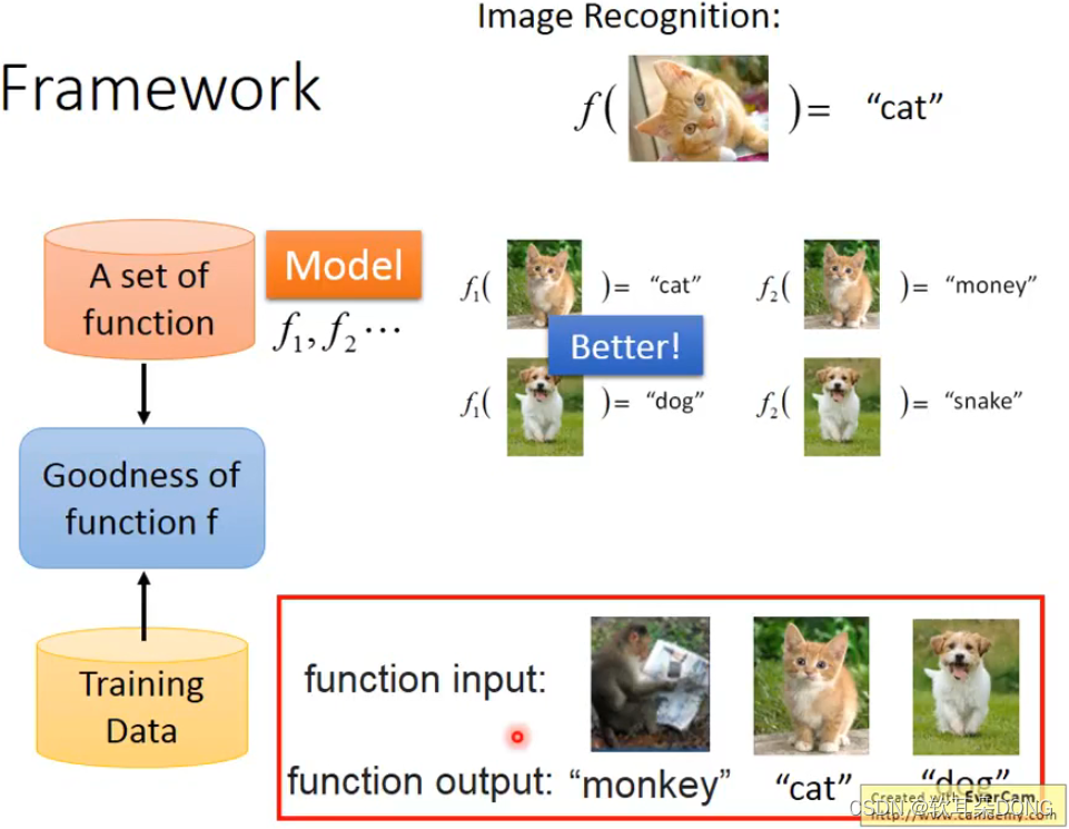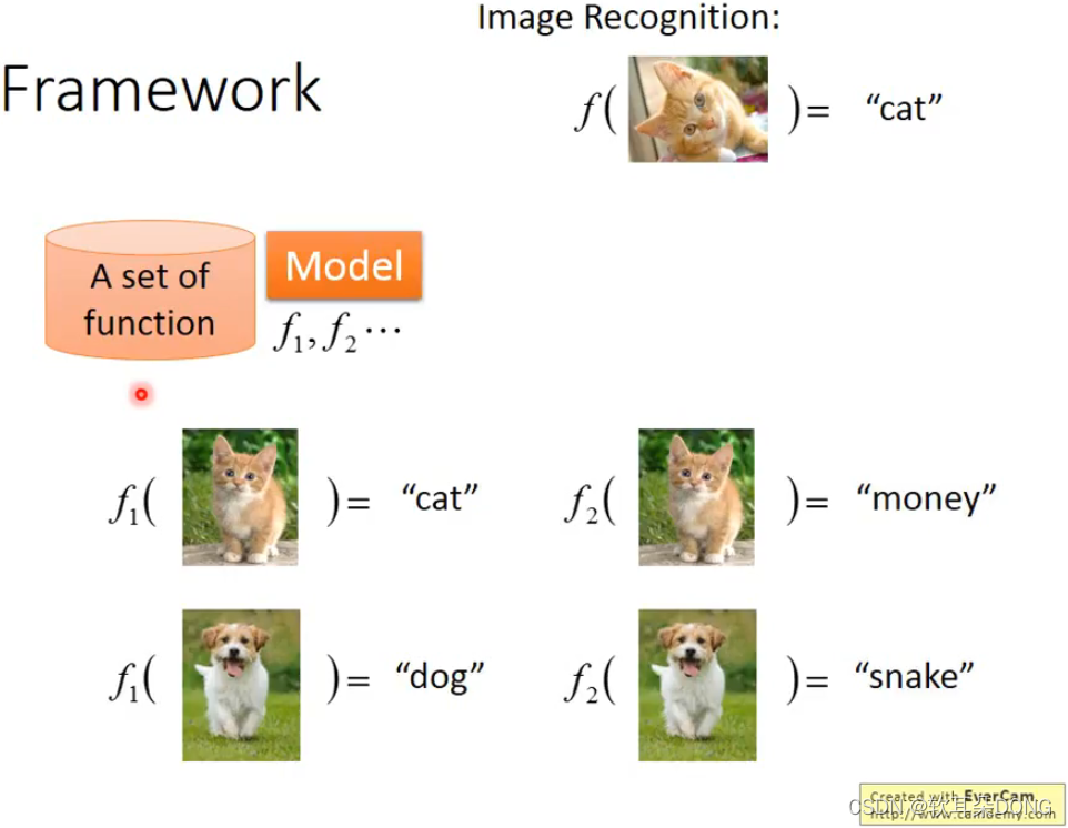 以下我們先很簡短的跟大家說明,怎麼樣找出一個Function。找出這個Function的Framework是甚麼呢?我們以影像辨識為例,我們要找一個 Function,輸入一張圖片,它告訴我們圖片裡有甚麼樣的東西。在做這件事,它的起手式是,你要先準備一個Function的Set,這個Function的Set裡面,有成千上萬的Function。舉例來說,這個 Function Set 裡面有一個 F1,你給它看一隻貓,它就告訴你輸出貓,給它看一隻狗,就輸出狗;有一個Function是F2,它很怪,你給它看貓它說是猴子,你給它看狗它說是蛇。你要準備一個Function Set,這個Function Set裡面有成千上萬的Function。這件事情講起來有點抽象,你可能會很懷疑說,這怎麼回事? 怎麼準備成千上萬的 Function?我怎麼把成千上萬的 Function 收集起來變成一個 Function?不過,這我們之後會再講。總之我們先講,假設你手上有一個Function的Set,其實這個Function的Set就叫做Model。