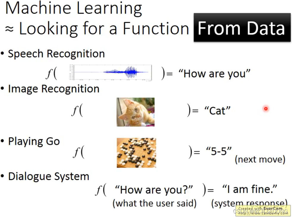 這是比較擬人化的說法,如果要講得更務實一點的話,Machine Learning 做的事情可以想成是在尋找一個 Function。你要讓機器具有一個能力,這個能力是根據你提供給它的資料,他去尋找出我們要尋找的 Function。那很多我們關心的問題,都可以想成是,我們就是需要一個 Function。舉例來說,語音辨識,在語音辨識這個問題裡面,我們要找一個 Function,它的輸入是聲音訊號,它的輸出是語音辨識的文字。這個Function非常非常的複雜,有人可能會想說我來用一些寫規則的方式,用一些語言學,讀很多語言學的文獻,然后寫一堆規則做語音辨識。這些事情 60 年代就有人在做了,到現在都還沒做出來。語音辨識太過複雜,這個 Function 太過複雜,不是人類可以寫出來,可以想像的。所以我們需要憑藉機器的力量,幫我們把這個 Function 找出來;或者說假設你要做影像辨識,那你就要找到一個 Function,輸入就是一張圖片,其實就是圖片裡面的 Pixel(像素),輸出就是這張圖片有什麼樣的東西;或者是這年頭大家都一直在說的 Alphago,如果你要做一個可以下圍棋的 Machine 的話,其實你需要的也就是找一個Function,這個 Function 輸入是圍棋上 19x19 路的棋盤的盤勢,你告訴機器說,在這 19x19 棋盤上,哪些位置有黑子,哪些位置有白子,然後機器就告訴你說,接下來下一步應該要落子在哪裡;或者是你要做聊天機器人,你需要的也是一個 Function,這個 Function 的輸入就是使用者的 Input,它的輸出就是機器的回應。