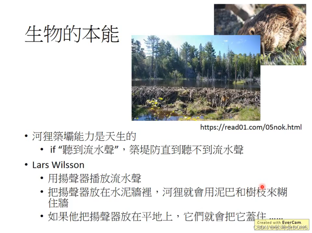 那麼我們先來看一下生物的本能。講一個跟機器學習一點都沒關係的,我們來講生物的本能。這個是河狸,河狸的特色就是,牠會築水壩把水擋起來。但是河狸怎麼知道要築水壩呢?河狸築水壩的能力是天生的。也就是說,這個河狸是天生的,牠在實驗室裡出生,牠沒有父母教牠怎麼築水壩,但是,牠一生下來,心裡就有一個衝動,就是牠想要築水壩。如果我們用程式語言來描述牠的話,牠內建的程式語言是這樣的:“If牠聽到流水聲,Then牠就築水壩直到聽不到流水聲為止”。所以生物學家就可以欺負河狸,他就用一個揚聲器來播放流水聲。如果把揚聲器放在水泥牆裡面,河狸就會在水泥牆上面放很多的樹枝,在水泥牆上築一個堤,然後想要把揚聲器的聲音蓋住。如果把揚聲器放在地上,河狸就會用樹枝把它蓋住,直到聽不到揚聲器的聲音為止。所以這是生物的本能。