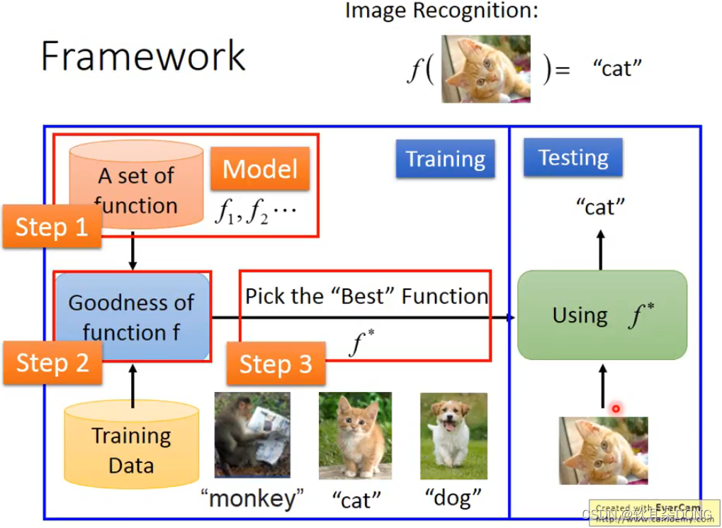現在機器有辦法決定一個Function的好壞,光能夠決定一個Function的好壞是不夠的,因為在你的Function Pool和Function Set裡面,它有成千上萬的Function,它有無窮無盡,幾乎是無窮。它有無窮的Function,不可勝數的Function,所以我們需要一個有效率的演算法。這個有效率的演算法,可以從Function的Set裡面,挑出最好的Function。一個一個Function衡量它好不好,太花時間了,實際上做不到,所以我們需要一個好的演算法,去從Function的Set裡面,挑出一個最好的Function。這個最好的Function,我們把它寫作F*。找出這個F*以後,接下來我們就希望拿它來做一些事情。我們可以拿它來做影像的辨識,輸入一張在Training Data裡沒有看過的貓,然後希望它的輸出也是貓。你可能會問說,機器學的時候沒有看過這隻貓,那怎麼知道在測試的時候找出來的最好的Function:F*可以正確的辨識這隻貓呢?這個就是,在Machine Learning裡面,非常重要的問題:就是 “機器有沒有舉一反三的能力”?這個我們之後會再講。左邊的部分叫做Training,就是學習的過程,右邊的部分叫做Testing,就是學好以後你就可以拿它來運用,這個是Testing。