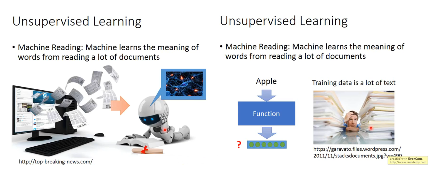 更進階的是Unsupervised Learning ,在 Unsupervised Learning 裡面,顧名思義,我們就是希望機器學到無師自通。如果在完全沒有任何Label的情況之下,到底機器可以學到甚麼樣的知識?舉例來說,如果我們給機器看大量的文章,在去網路上收集大量的文章很容易,網路上隨便爬,八卦板隨便爬一爬就有。這種機器看過大量的文章以後,它到底可以學到甚麼事情?它能不能夠學會每個詞彙的意思?要讓機器學會每個詞彙的意思,你可以想成是我們要找一個Function,然後你把一個詞彙丟進去,比如說你把Apple丟進這個Function裡面,機器要輸出告訴你說,這個詞彙是什麼意思。也許它用一個向量來表示這個詞彙的各種不同的特性,不同的Attribute。但是現在假如是一個Unsupervised Learning的問題,你現在只有一大堆的文章,也就是你只有詞彙,你只有Function的輸入,沒有任何的輸出,那到底要怎麼解這個問題?