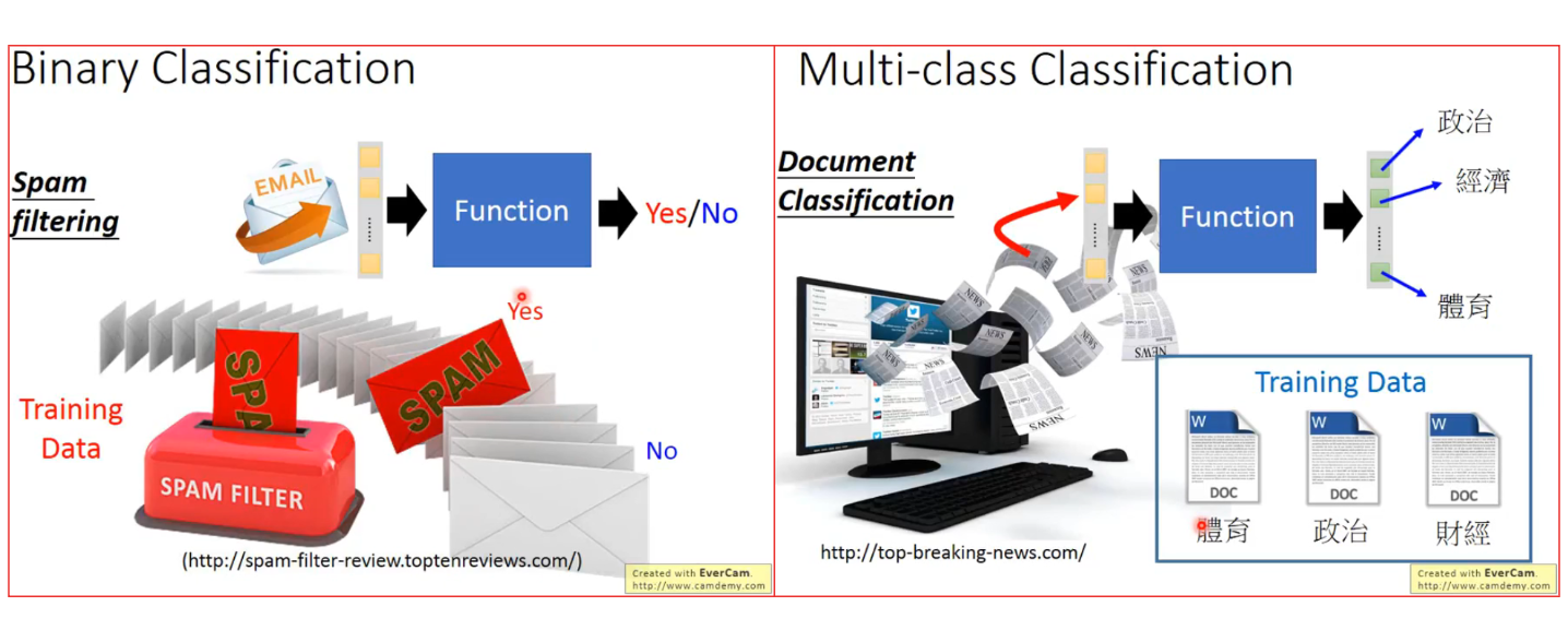 我們就為Binary和Multi-Class Classification分別舉一個例子。舉例來說,G-Mail有做Spam Filtering(垃圾邮件过滤)這件事。它自動偵測出垃圾郵件,幫你把它放在垃圾郵件夾內。那它怎麼做到這件事呢?其實我們需要的就是一個Function,這個Function的輸入就是一封E-Mail。當然,要怎麼讓一個Function吃一個E-Mail當作輸入?是你自己要想想看的,這個我們未來再講。這個Function吃一個E-Mail當作輸入,它的輸出就是這封E-Mail是垃圾郵件,還是不是垃圾郵件?你要訓練這樣的Function,怎麼做?很簡單,你就給它一大堆的Data,告訴它說,現在輸入這一封郵件,你應該說它是垃圾郵件。輸入這一封郵件,你應該說它不是垃圾郵件。你給它夠多的這種資料去學,它就可以自動找出一個可以偵測垃圾郵件的Function。