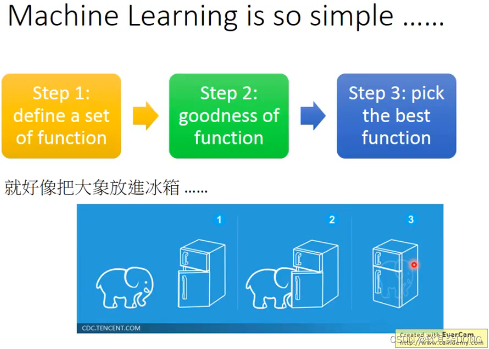 所以機器學習就是三個步驟,當然這三個步驟其實異常的簡化了整個Process,講說機器學習只有三個步驟,就好像講說如果我們要把大象塞進一個冰箱,其實也是三個步驟。你怎麼把大象塞進冰箱? 就是把門打開,把大象趕進去,然後把門關起來,然後就結束了。所以說機器學習只有三個步驟就好像是說,把大象放進冰箱,也只需要三個步驟,意思是一樣的。