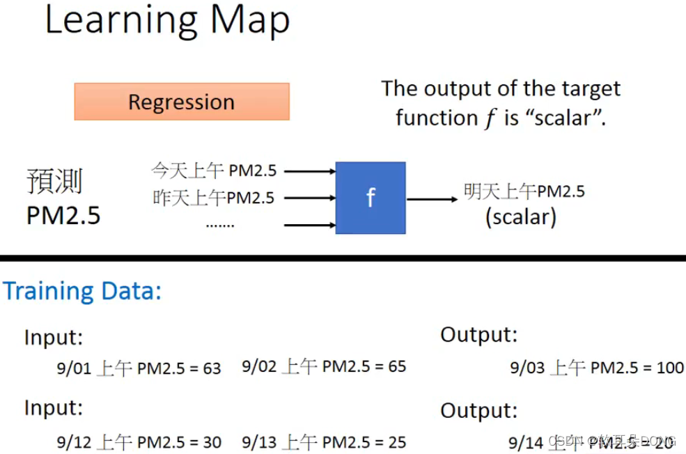 我們先從圖的左上角開始,這個圖的左上角是Regression(回归),甚麼是Regression?Regression是一種 Machine Learning 的Task。當我們說我們要做 Regression 時的意思是說,我們今天要Machine找出來的Function,它的輸出是一個Scalar,是一個數值,一個Real Number,這個叫做 Regression 。舉例來說,在作業一裡面,我們會要你做Pm2.5的預測,也就是說你要找一個Function,這個Function的輸出,就是未來某一個時間,舉例來說,明天上午的Pm2.5。Pm2.5是一個數值,是一個Number。所以這個是一個 Regression 的Problem。那機器要判斷說,今天這個Function要輸出明天上午的Pm2.5。那明天上午的Pm2.5,你要給它一些額外的資訊,它才能夠猜出明天上午的Pm2.5。你給他的資訊,可能是今天上午的Pm2.5,昨天上午的Pm2.5等等。這就是一個Function, 它吃的是我們給它的,過去的Pm2.5的資料,它輸出的是預測未來的Pm2.5。你要訓練這種Machine,如同我們剛才在講Machine類的Framework裡面講的,你要準備一些訓練資料。甚麼樣的訓練資料?你就告訴他說,今天根據我們過去的,從政府的Open Data上收集來的資料,9月1號上午的Pm2.5是這個樣子,9月2號是這個樣子,9月3號是這個樣子,所以一個好的Function,輸入這樣子的一個Pm2.5,它應該輸出這樣的Pm2.5。給它9月12號Pm2.5,9月13號Pm2.5,它應該輸出9月14號的Pm2.5。收集到夠多這樣的Data,就可以訓練一個可以做氣象預報的系統。