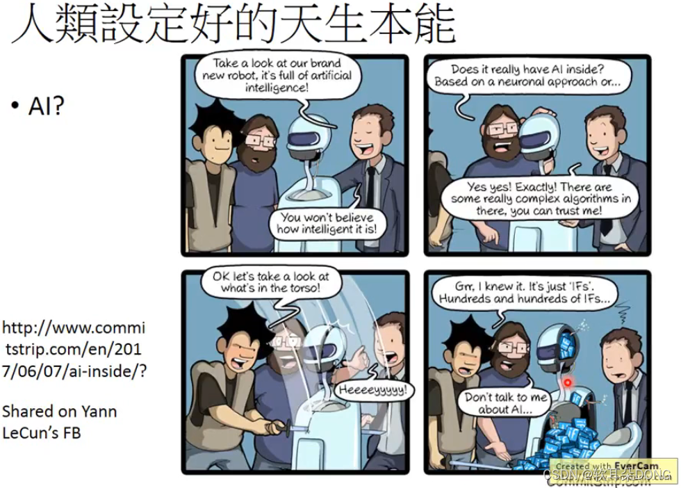 我知道说Ai 這個詞現在非常非常非常的熱門,所以會有各式各樣,奇奇怪怪的東西。我覺得現在常遇到的問題,也许可以用以下這個漫畫來說明,這是個四格漫畫,這個漫畫並不是隨隨便便的一個四格漫畫,這個一塊畫是 Yann LecunShare 在他的 Facebook 上的漫畫。這個漫畫說甚麼呢?現在也一定常常在新聞或者是商展上看到這種東西。有一個 Sales 說,看看我們最新的人工智慧機器人,它就是非常的人工智慧。要 Show 這個系統呢,要搭配一個能言善道的 Sales,加上一個非常非常潮的前端跟外殼,裡面是甚麼沒有人知道。外面的觀眾就問說,它就是用甚麼 Neural 的方法做的嗎?对对对,反正就是,最潮的 Ai 的技術就對了。但是有時候你把它剖開來看,裡面都通通都是 “If” 掉出來這樣。我知道現在,政府、企業他們都說想要推廣 Ai,有時候他們想要推廣的 Ai,其實是這種 Ai。這個其實不是我們現在應該要做的事,如果你要推廣的是這種 Hand-Crafted 的 Ai 的話,你怎麼 50 年前不推廣一直到今天才突然做了呢?今天我們要走的不是這個路線,如果是這個路線,它應該是要被 Diss 的。