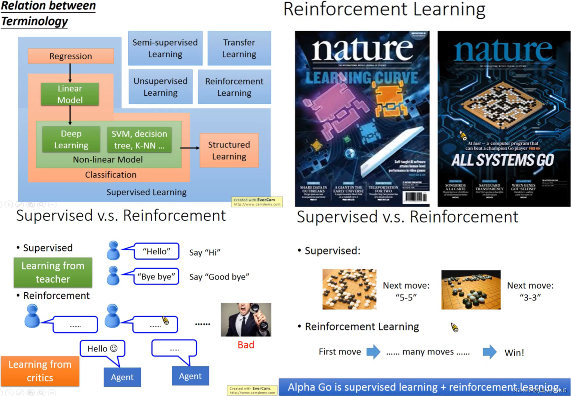 最後還有一個現在大家都耳熟能詳的,就是Reinforcement Learning的Problem。所謂 Reinforcement Learning 的意思是甚麼呢?現在大家都或多或少知道,至少知道它是一個很潮的東西。這個 Reinforcement Learning 其實是一個發展很久的問題,它絕對不是一個新的技術。最近會比較受到重視,一開始是因為Deepmind拿 Reinforcement Learning 的技術去玩Akari的遊戲,去玩一些小游戏,在小遊戲上可以痛扁人類。他們現在很厲害,會把Paper發到Nature上去。另外第二個大家都知道的例子,就是Alphago,我們都知道Alphago裡面有用到 Reinforcement Learning 的技術。