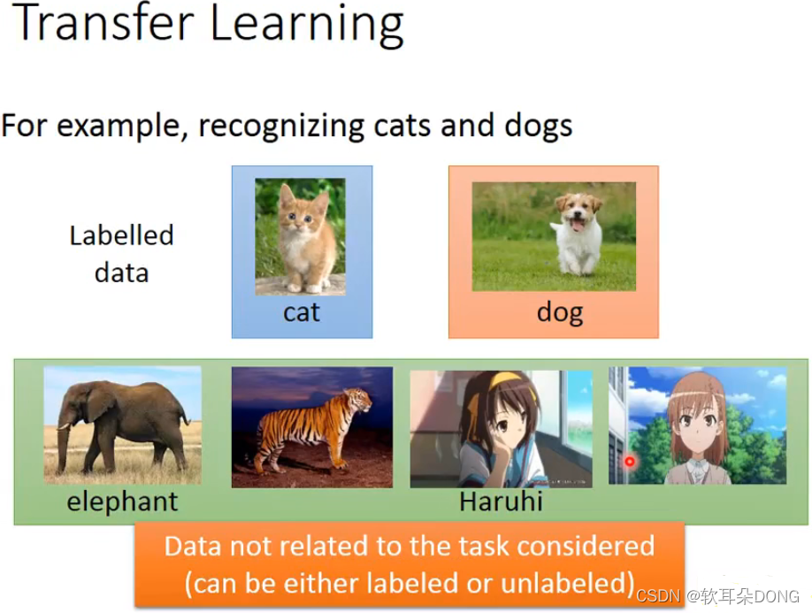 那另外一個減少Data用量的方向是Transfer Learning,所谓的Transfer Learning的意思是說,假設一樣我們要做貓和狗的分類問題,我們也一樣只有少量的有Labeled的Data,但是我們現在有另外大量的Data,這些大量的Data它可能有Labeled,也可能沒有Labeled,但是它跟我們現在要討論的問題是沒有甚麼特別的關係的。我們要分辨的是貓和狗的不同,但是你這邊有一大堆其他动物或動畫的圖片,這個是涼宮春日,這個是御坂美晴。你有一大堆不相干的圖片,它到底可以帶來甚麼樣的幫助?這個就是Transfer Learning要講的問題。