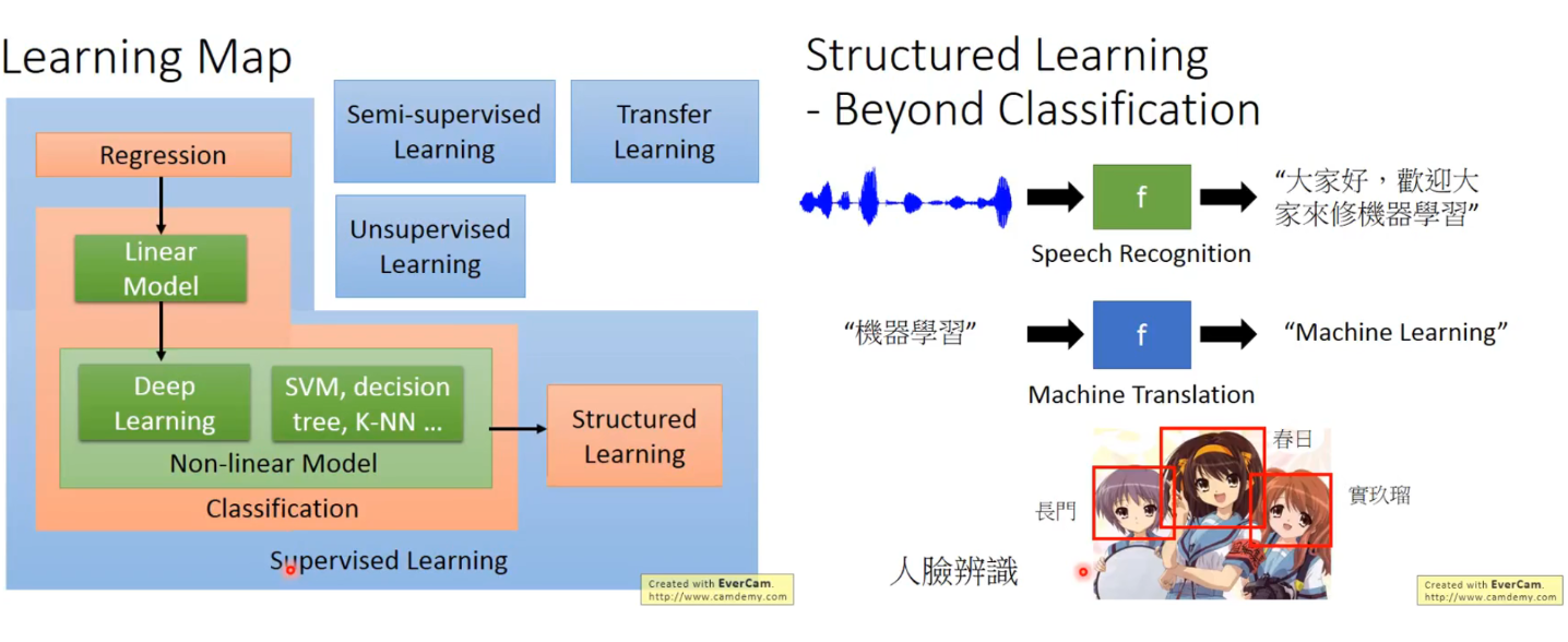 接下來,我們剛才講的是不同的Learning的Scenario。在Machine要解的任務上,我們講了Regression的Problem,講了Classification的Problem。還有一類的問題是你比較少聽過的,這類的問題叫做Structured Learning。這類的問題叫做Structured Learning。甚麼是Structured Learning呢?在Structured Learning裡面,我們要機器輸出的是一個有結構性的東西。剛才在Regression Problem裡面機器輸出幾個數值;在分類的問題裡面機器只是輸出一個選項,它選一個選項;在Structured類的Problem裡面,機器要輸出的是一個複雜的物件。舉例來說,在語音辨識裡面,機器的輸入是一個聲音訊號,輸出的是一個句子,句子是由許多詞彙拼湊而成,它是一個有結構性的Object;或者是說在機器翻譯裡面,你說一句話,然後你輸入中文,你希望機器翻譯成英文,那機器的輸出也是一個句子,這也是有結構性的東西;或者是說,你今天要做的是人臉辨識,你給機器看一張圖片,它會知道說,最左邊是長門,中間是涼宮春日,最右邊這個,不是每個人都知道,這個是朝比奈實玖瑠。它要把這些東西標出來,這也是個Structured Learning的Problem。