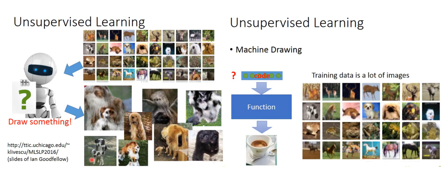 或者是我們舉另外一個 Unsupervised Learning 的例子,假設我們今天帶機器去動物園,讓它看一大堆的動物。它能不能在看了一大堆動物之後,它就學會自己創造一些動物。這個都是真實的例子,這是從Ian Goodfellow投影片上載下來的。仔細看了大量的動物以後,它就可以自己畫一些狗出來。像它畫的有眼睛長在身上的狗,還有乳牛狗這樣子。像這樣子的一個Task,它也是個Unsupervised Learning的Problem。你的Function的輸入,不知道是甚麼,可能是某一個Code,它代表了要輸出圖片的特性,那輸出是一張圖片。你給機器看到的,只有非常大量的圖片,你只有Function的Output,沒有Function的Input。在這種情況下,機器怎麼學會自己生成新的圖片?這個是我們之後會再Cover的問題。