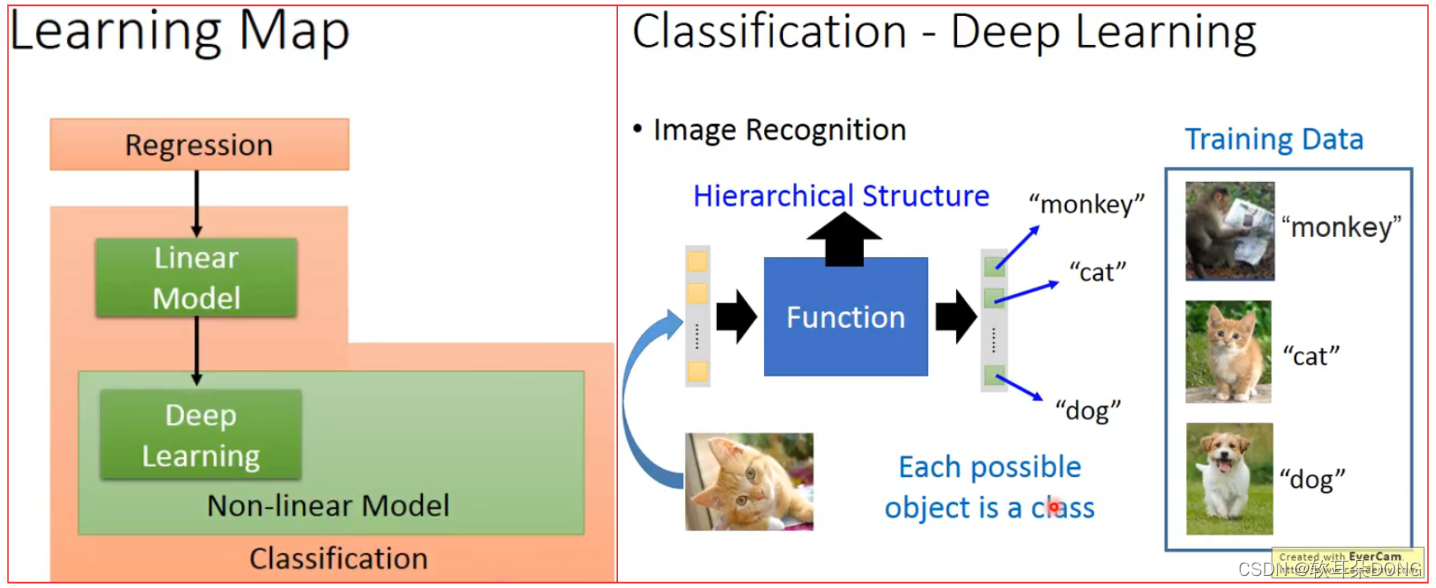 剛才講的,都是你要Machine解的任務。再來要講的,在解任務的過程中,第一步就是要選一個Function的Set,那選不同的Function Set,你會得到不同的結果。選不同的Function Set就是選不同的Model。Model很多種,舉例來說,最簡單的是Linear的Model,我們會花很多時間Focus在Non-Linear的Model上面。那在Non-Linear的Model裡面,其中一個今日最耳熟能詳的,就是Deep Learning。所謂的Deep Learning的意思是说,之後我們會再細講Deep Learning的內容,今天只要知道說,在做Deep Learning的內容時候,我們的Function是特別複雜的,所以它可以做特別複雜的事。舉例來說,它可以做影像的辨識,這個特別複雜的Function,它可以描述這個 Pixel 和它的 Class 之間的關係。你要找這樣子的Function,你就是準備一些訓練資料,給機器去學就可以了。