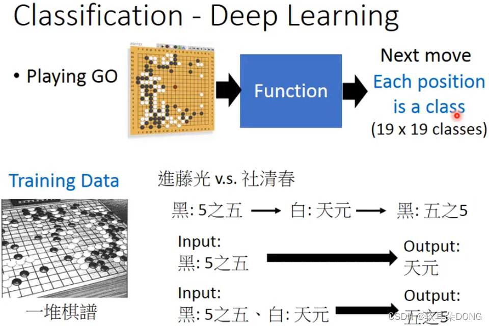 用 Deep Learning 的技術,你也可以讓機器學會下圍棋。那在下一節的Task,下一節的Task其實就是一個分類的問題。只是這個分類的問題我們需要一個很複雜的Function,給它的輸入,是一個棋盤的盤式,那輸出就是下一步應該落子的位置。我們知道說,一個棋盤上就是有19x19的位置是你可以落子的,所以今天下圍棋這件事情,你就可以把它想成是一個19x19個類別的分類問題。或者说,你可以把它想成是一個有19x19個選項的選擇題。那你要怎麼訓練機器,讓它學會下圍棋呢?你要收集訓練資料,告訴機器说,現在這個Function的輸入輸出,分別應該是甚麼。看到某樣的盤式,我們應該輸出甚麼樣的Output。那怎麼收集這種資料呢?你可以從人類過去下的棋譜裡面,收集這樣子的資料。舉例來說,你收集了進藤光和社清春下的那一盤棋的棋譜。在那一盤棋裡面,首先首先社清春出手先下5之五,然後大家就非常的訝異;然後進藤光次手再下天元,大家又更加訝異,然後社清春第三手再下五之5,大家就非常非常的訝異。所以你有了這樣子的棋譜後,你就告訴Machine說,如果現在棋盤上有人落子在5之五,那下一步你就落子在天元。如果現在5之五和天元都已經有子了,那你就落子在另外一個五之5的位置。然后呢,你給它更多的棋譜,它就可以學會怎麼下圍棋了。