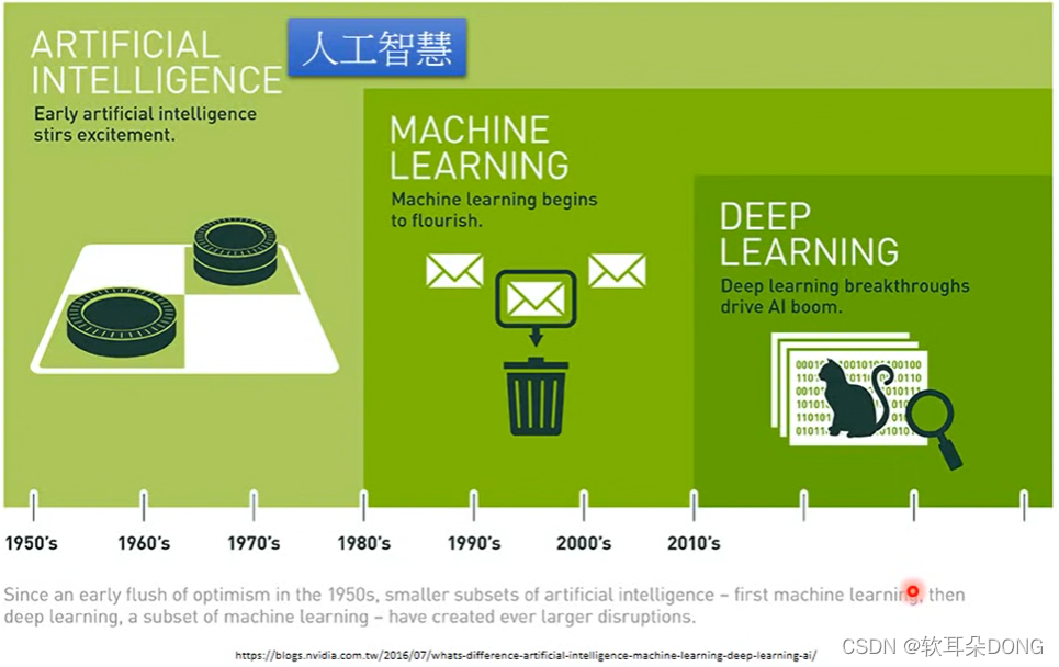 這一門課,我們預期可以學到甚麼呢?我想很多同學心理的預期就是:”你可以學到一個很潮的人工智慧“。我知道從今年開始,“人工智慧” 這個詞,突然變得非常非常非常的熱門。大家、政府、Industry,通通都在講 “人工智慧” 這個詞。但人工智慧是甚麼呢?人工智慧其實一點都不是新的詞彙。人工智慧這個詞,Ai 這個詞,Artificial Intelligence 這個詞,在 1950 年代就有了!這個詞意味著甚麼呢?這個詞意味著人類長遠以來的目標:希望機器可以跟人一樣的聰明。在科幻小說裡面,我們看到很多的幻想和期待。在很長的一段時間內,人們並不知道怎麼做到人工智慧這件事情。直到後來,大概 1980 年代以後,有了機器學習的方法。機器學習,顧名思義,從名詞就可以猜出,就是讓機器具有學習的能力。機器學習跟人工智慧有甚麼關係呢?人工智慧是我們想要達成的目標,而機器學習,是想要達成目標的手段!讓機器透過學習的方式,它可以跟人一樣聰明。而深度學習和機器學習有甚麼關係呢?深度學習就是機器學習的其中一種方法。在有深度學習機器學習之前,人們用什麼樣的方式來做到人工智慧這件事呢?我記得高中生物學告訴我們說,生物的行為取決於兩件事:"一個是後天學習的結果。不是後天學習的結果就是先天的本能”。這對機器來說也是一樣,它怎麼樣表現得很有智慧?要嘛就是透過後天學習的手段,表現得很有智慧;要嘛就是,這是它先天的本能。機器為甚麼會有先天的本能?那個本能就是它的創造者,其實就是人類,幫它事先設定好。