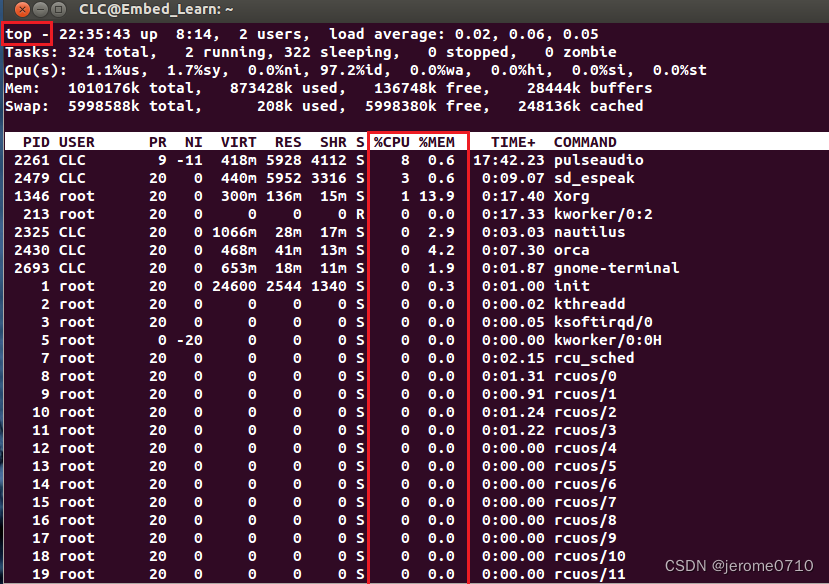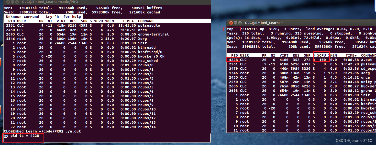结果:可以看到当前进程由于while一直循环未退出,导致进程占用率百分之百