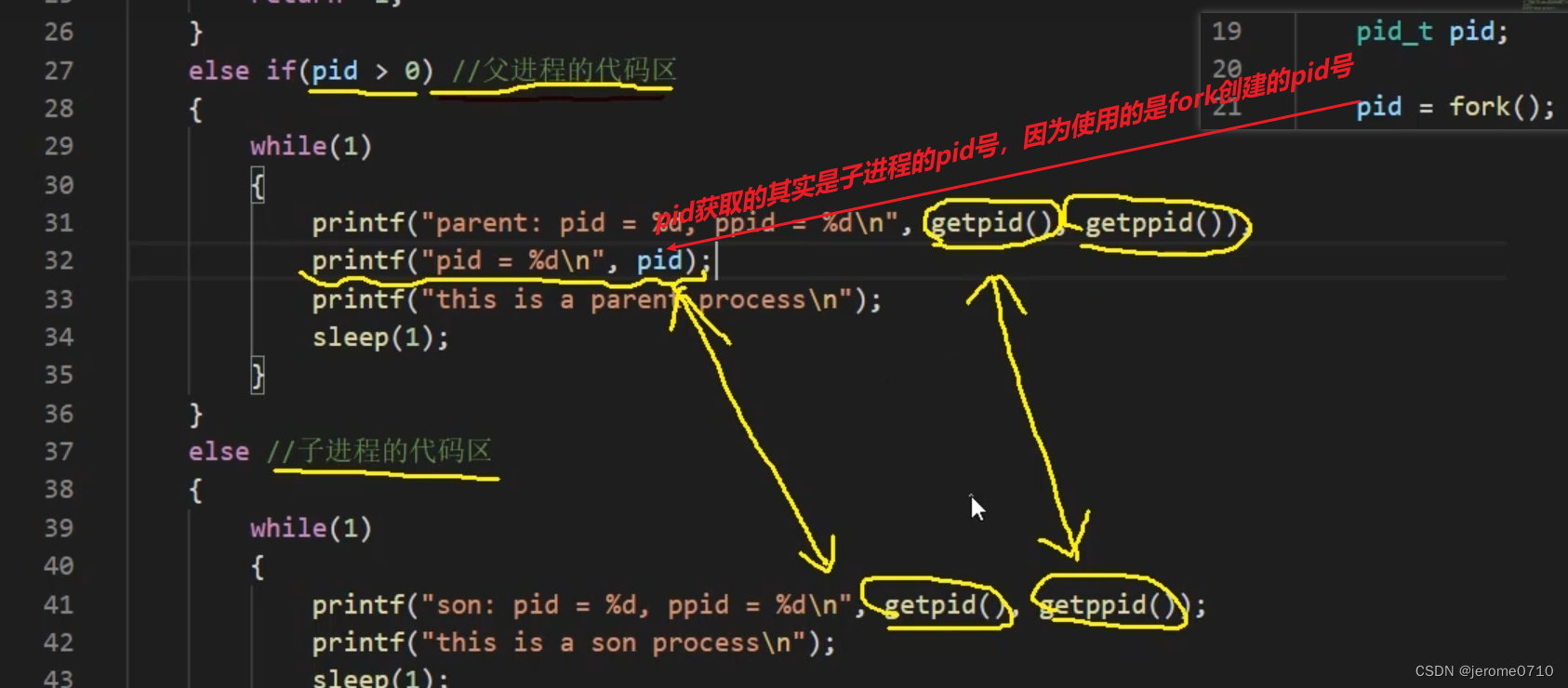 18 //通过fork函数的返回值来区分父子进程的独立的代码区