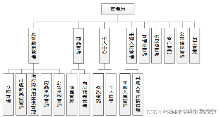 管理员具备的详细功能将参照最终的设计结果,即图4.1所示的管理员功能结构图。其中管理员查看商品库存统计报表,对商品,商品预定信息,供应商信息,商品采购入库信息,客户信息,公告信息,员工信息等进行管理。