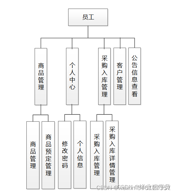 员工具备的详细功能将参照最终的设计结果,即图4.2所示的员工功能结构图。其中员工查询商品,添加商品预定信息,添加商品采购入库信息,添加客户信息,查看公告等。