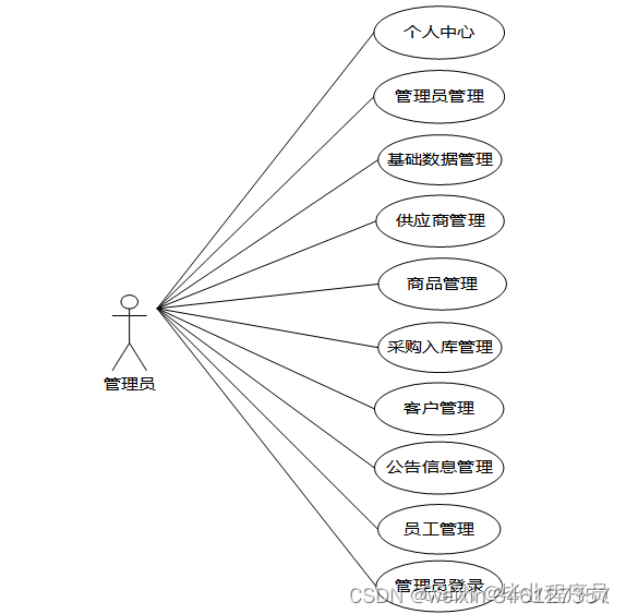 库存管理系统的操作者有管理员,分析的管理员功能将使用用例图进行展示。图3.4展示了管理员用例图。管理员查看商品库存统计报表,对商品,商品预定信息,供应商信息,商品采购入库信息,客户信息,公告信息,员工信息等进行管理。
