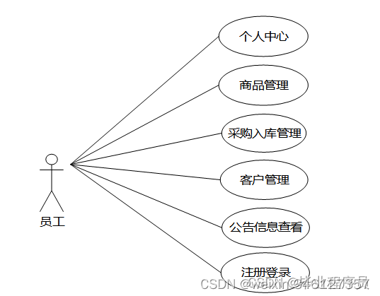 库存管理系统的操作者有员工,分析的员工的功能将使用用例图进行展示。图3.5展示了员工用例图。员工查询商品,添加商品预定信息,添加商品采购入库信息,添加客户信息,查看公告等。