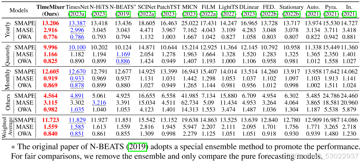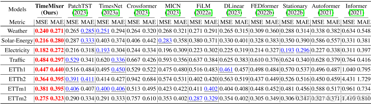 (3)TimeMixer在广泛的基准测试中以卓越的效率在长期和短期预测任务中实现了一致的最先进的性能。