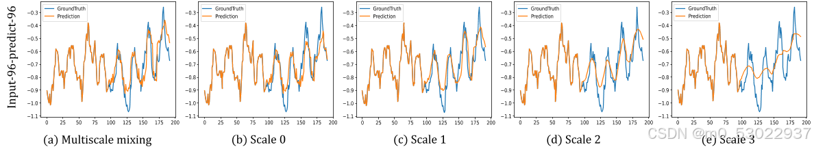 (3)在ETTh1数据集上,对96-96上,对几个尺度的可视化及多尺度混合的效果如下图: