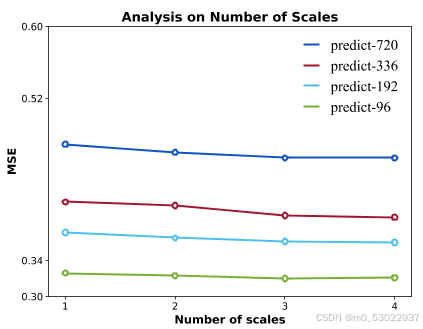 当 M 增加时,较短预测长度的性能增益下降。相比之下,对于更长的预测长度,随着 M 的增加,性能会有所提高。因此,我们将 M 设置为 3 进行长期预测,将 1 设置为短期预测以权衡性能和效率。