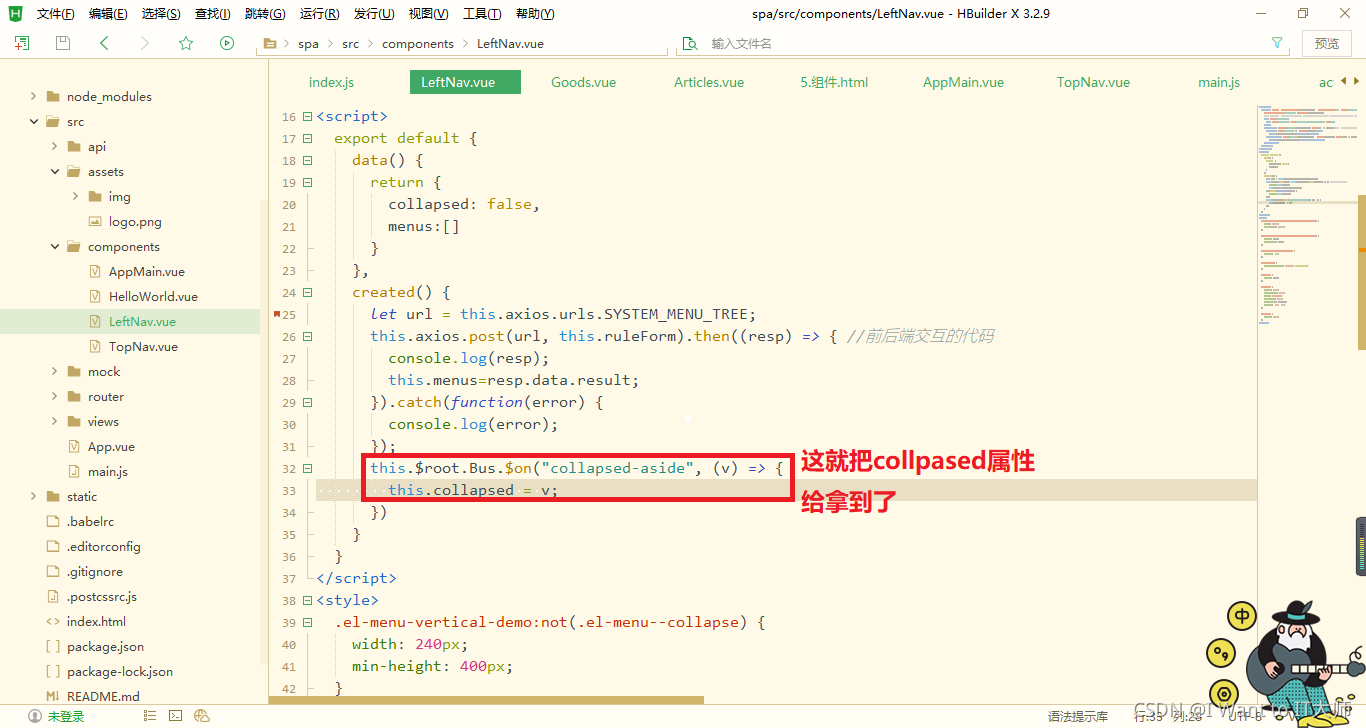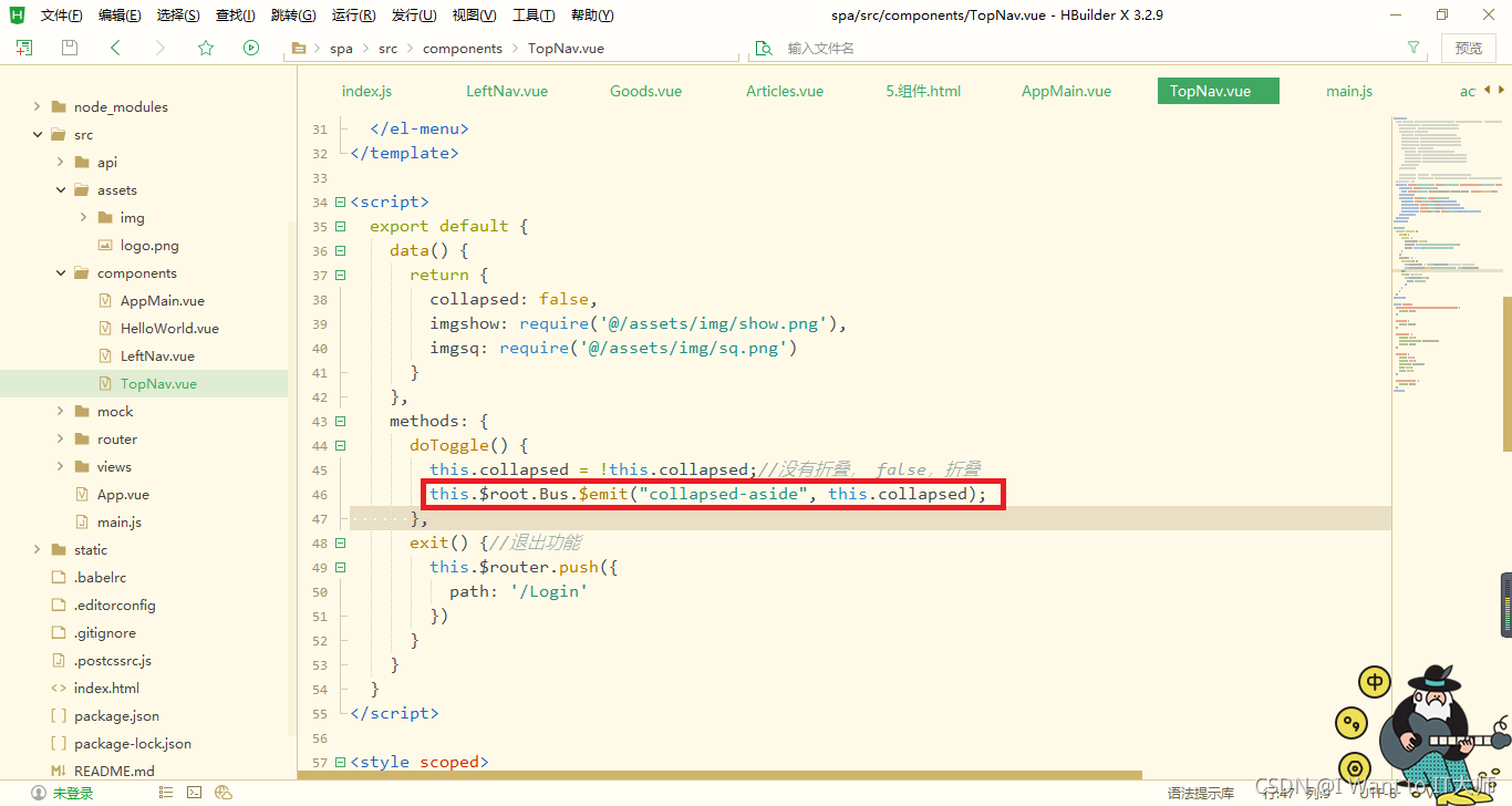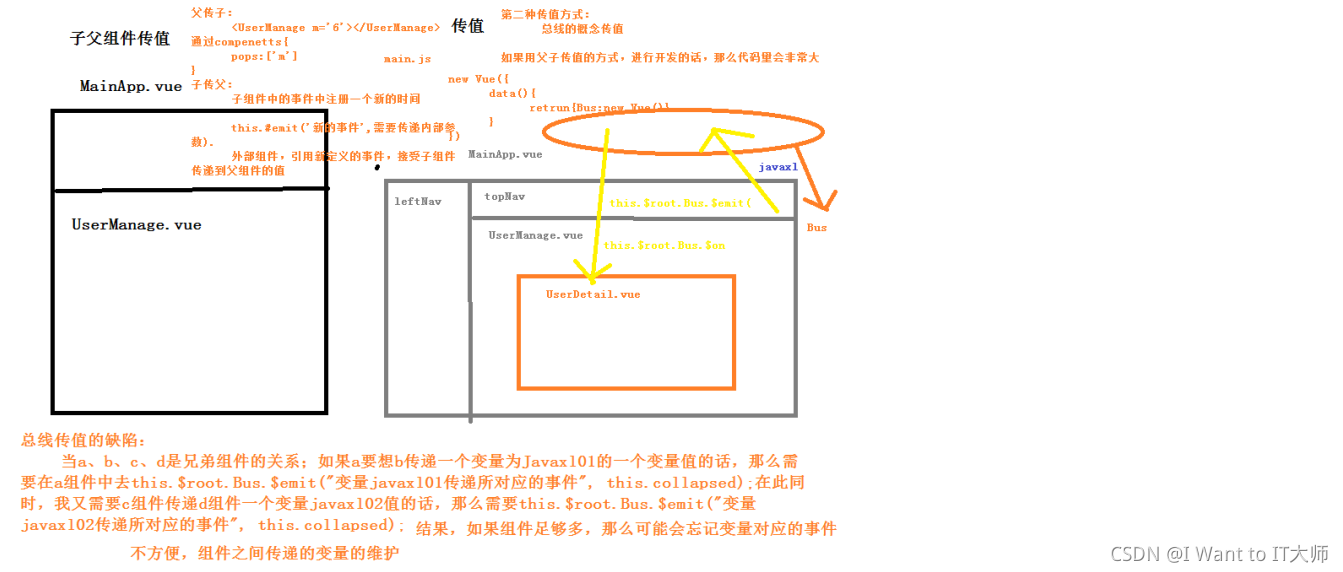 这种方式的传值是通过数据总数Bus,this.$root.$emit('事件名',参数1,参数2,...)下面这张图,是一个TopNav组件想要传值给LeftNav组件通过总线来传值的方式:
