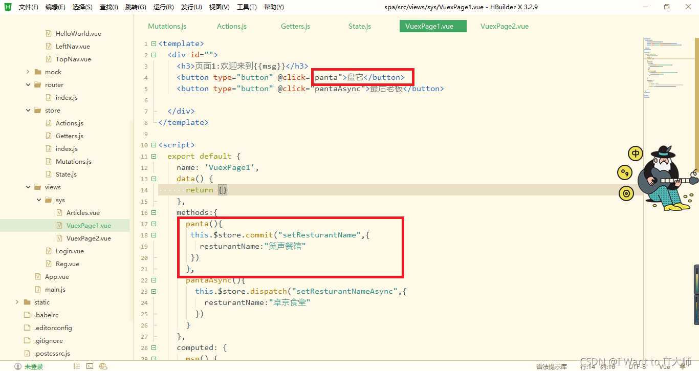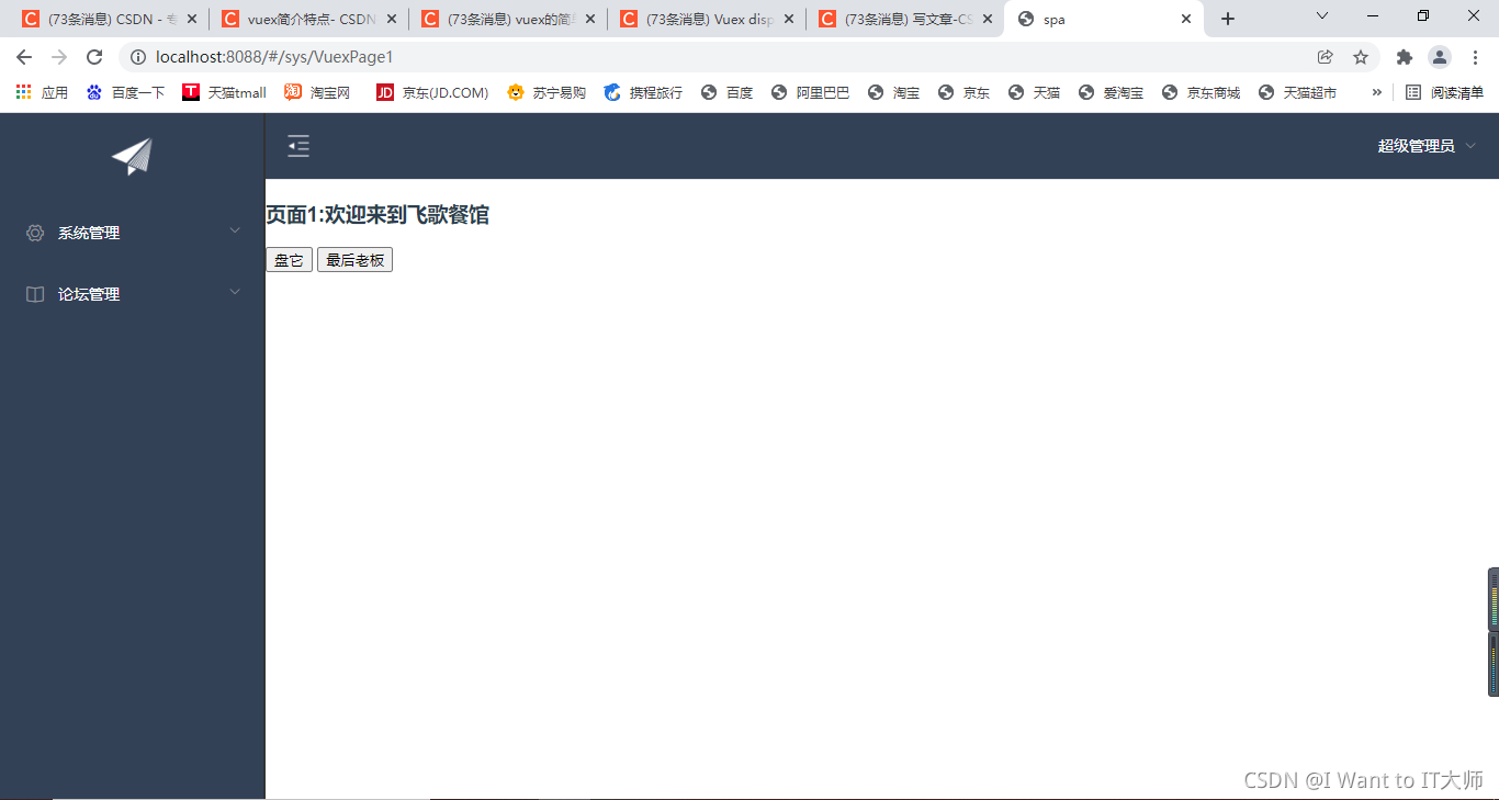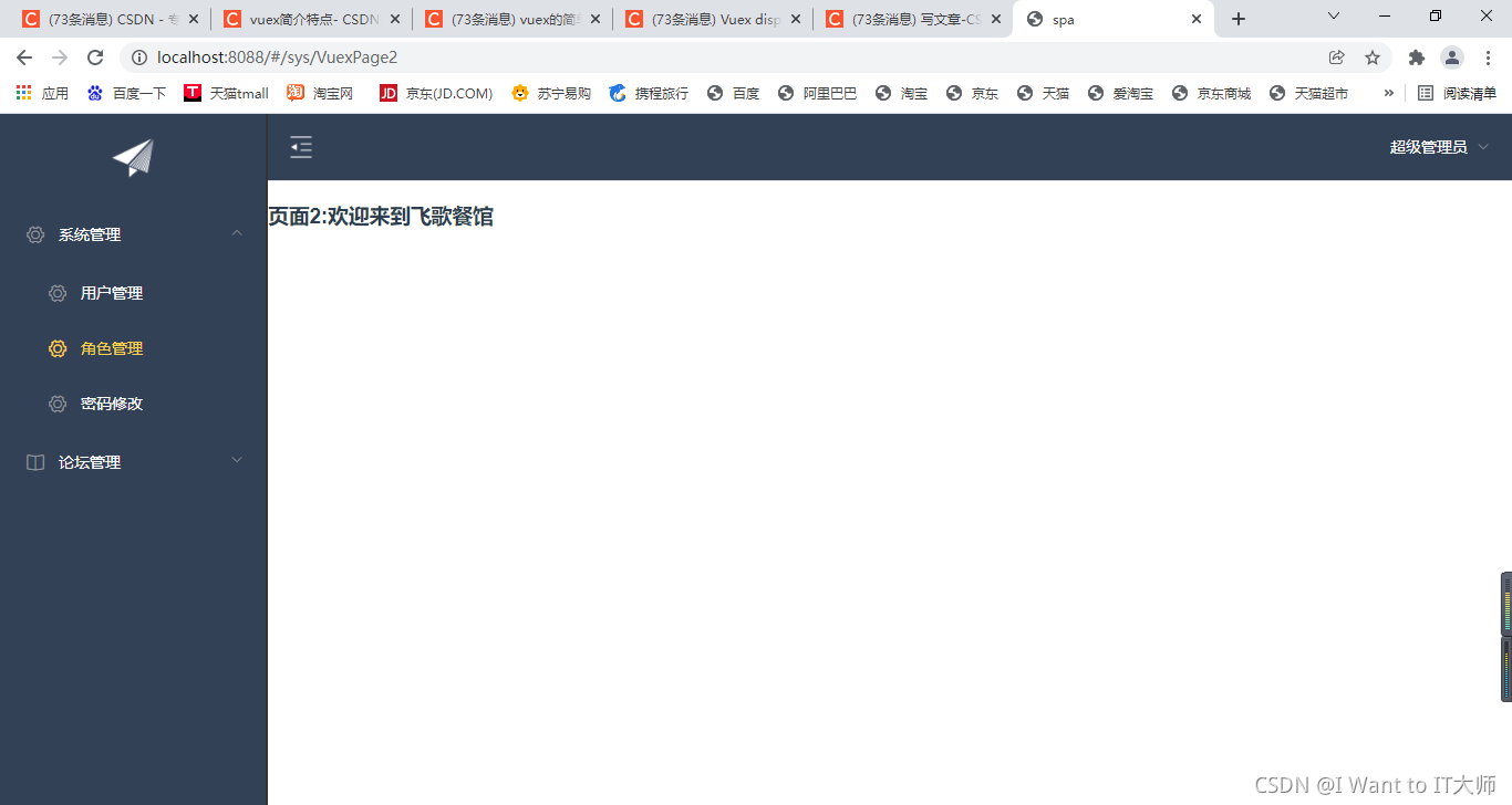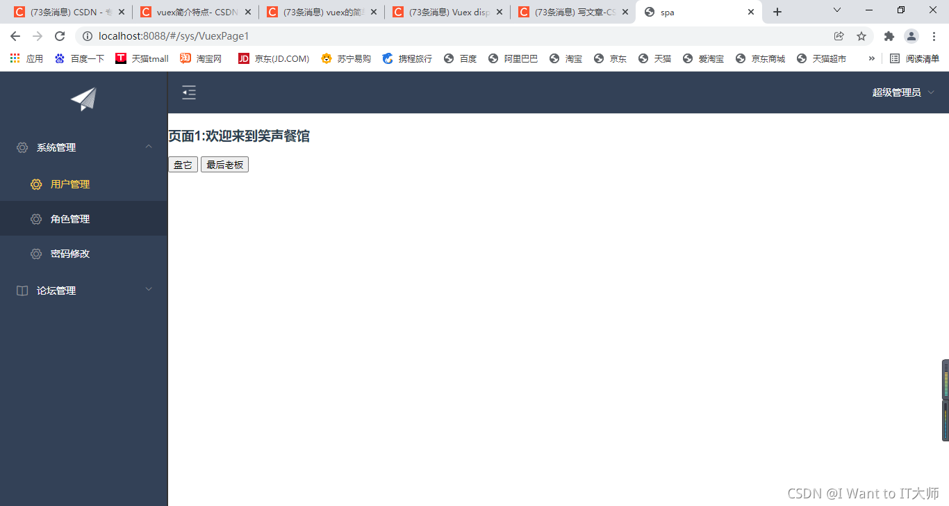 代码验证思路:现在有两个界面,一个是VuexPage1(用户管理)界面,另一个是VuexPage2(角色管理)界面,当我在VuexPage1点击改变值的方法时,就会调用Mutations.js文件中的setResturantName方法,VuexPage1的值发生改变时,这时VuexPage1中的值也会随之改变两个界面中的值同时进行改变。