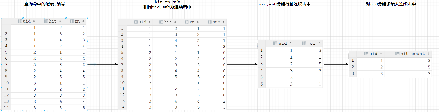 m int -- 是否命中 1命中 0 未命中。hit int , -- 第几次打地鼠。uid int , -- 用户名。查询用户最大连续命中次数。