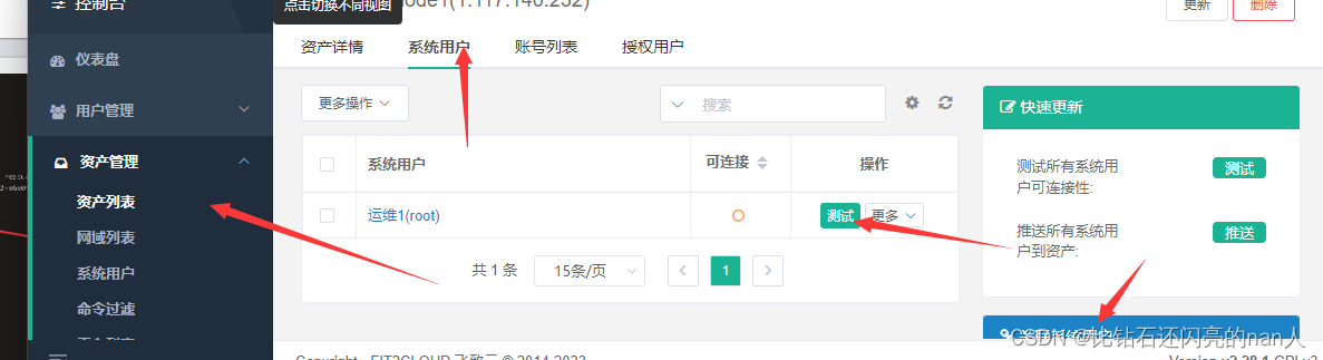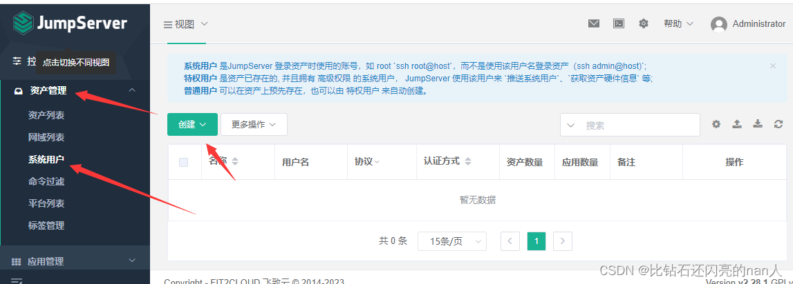 1.系统用户 是JumpServer 登录资产时使用的账号,如 root ssh root@host,而不是使用该用户名登录资产(ssh admin@host) 2.特权用户 是资产已存在的, 并且拥有 高级权限 的系统用户, JumpServer 使用该用户来推送系统用户、获取资产硬件信息` 等;