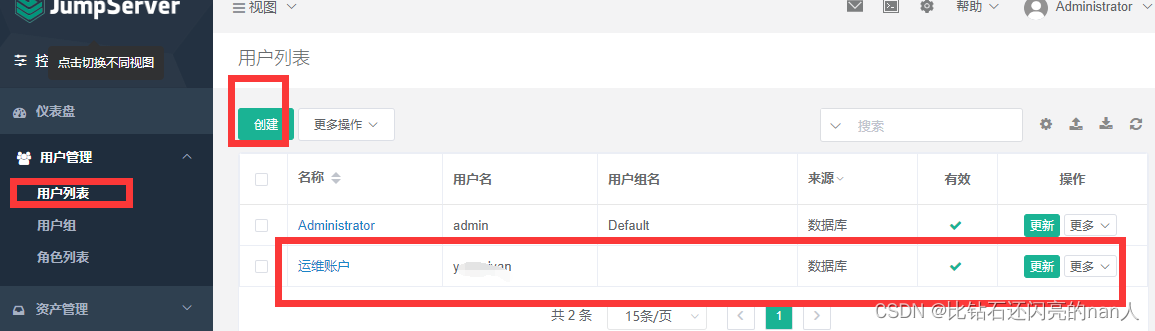 1.用户管理里面的用户列表 是用来登录jumpserver平台的用户, 用户需要先登录jumpserver平台, 才能管理或者连接资产