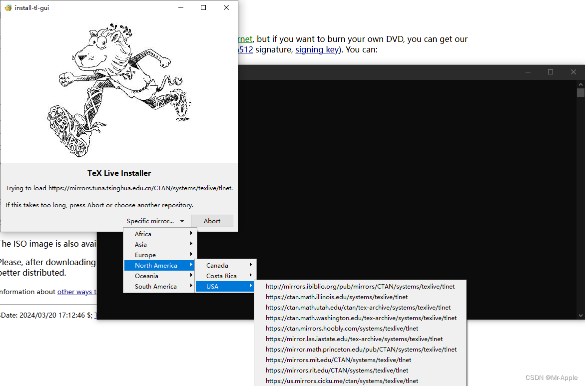 官方虽然不推荐使用镜像文件安装,但是奈何校园网它限速,下载6.4G需要7h,所以采用iso安装方式,这样只需要联网下载一下东西,或者是直接拷贝安装。清华镜像资源:https://mirrors.tuna.tsinghua.edu.cn/CTAN/systems/texlive/Images/中科大镜像资源:https://mirrors.ustc.edu.cn/CTAN/systems/texlive/Images/这种方式需要30-60mins,比之前快。在iso安装页面选择最近的镜像站。