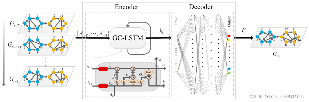 GC-LSTM:用于动态网络链路预测的图卷积嵌入原理+代码(上)原理部分 GC-LSTM利用GCN提取图数据的拓扑结构特征,LSTM提取序列数据的时序特征,从而能够对动态变化的图拓扑进行预测。本文详细介绍了GC-LSTM模型的原理,并基于PYG Temporal对其进行代码实现。