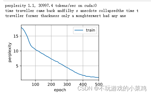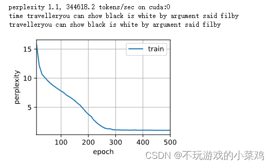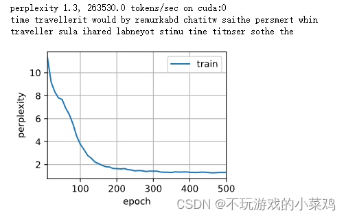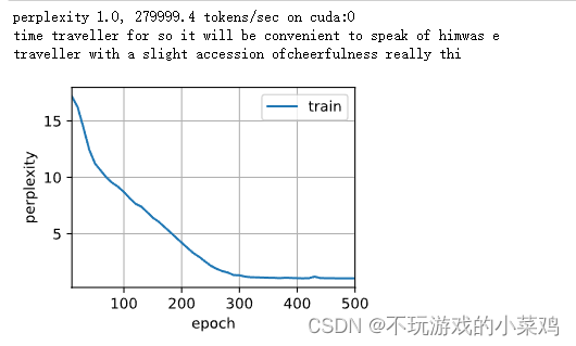 d2l.train_ch8(model, train_iter, vocab, lr, num_epochs, device)