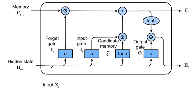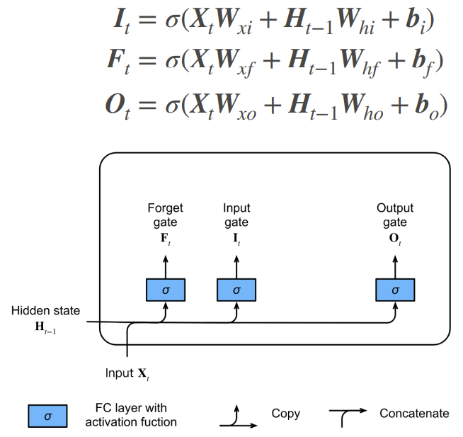 - 类似于门控循环单元,当前时间步的输入和前一个时间步的隐状态作为数据送入长短期记忆网络的门中,由三个具有 sigmoid 激活函数的全连接层处理,以计算输入门、遗忘门和输出门的值(这三个门的值都在 0~1 的范围内)