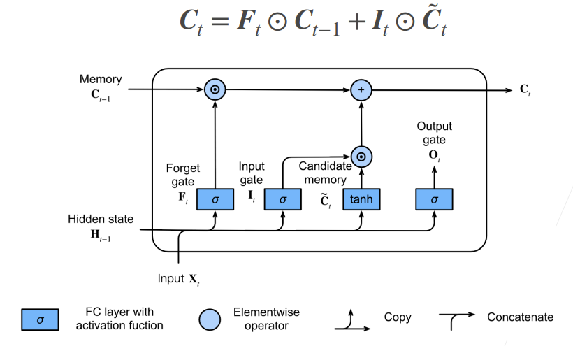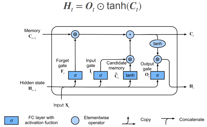 - 如果遗忘门始终为 1 且输入门始终为 0 ,则过去的记忆元 C(t-1) 将随时间被保存并传递到当前时间步(引入这种设计是为了缓解梯度消失的问题,并更好地捕获序列中的长距离依赖关系)