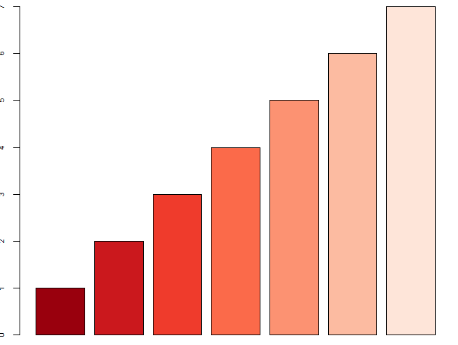 barplot(1:7, col=rev(brewer.pal(7, 'Reds'))) # rev函数可以反向排列