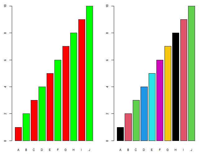 barplot(x, names=a, col=c('red','green')) # 循环使用2种颜色