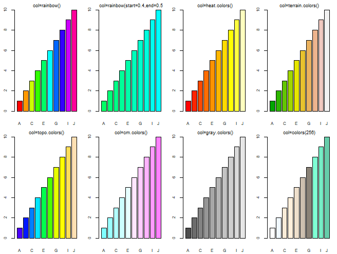 barplot(x, names=a, col=rainbow(10), main='col=rainbow()')