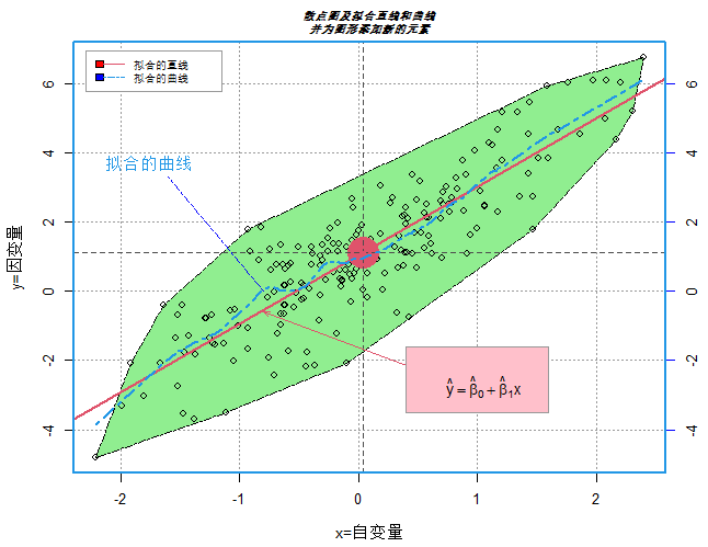 text(-2.2, 3.5, labels=expression('拟合的曲线'), adj=c(-0.1, -0.02),col=4)