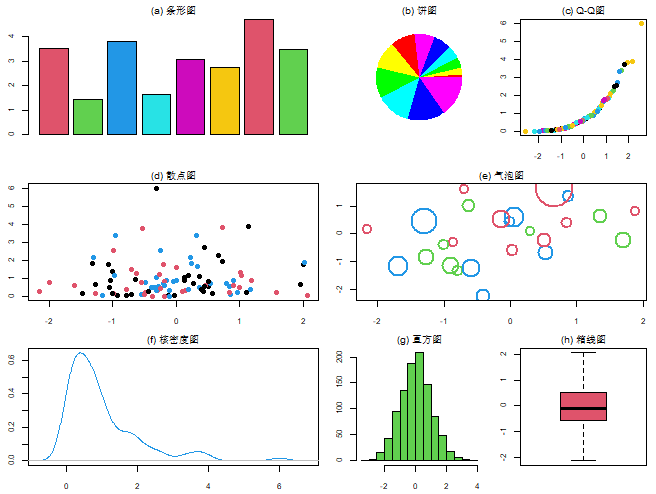 plot(rnorm(25), rnorm(25), cex=(y+2), col=2:4, lwd=2, xlab='', ylab='', main='(e) 气泡图')
