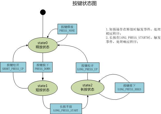 该按键程序的核心是状态机处理函数,对程序中的各个按键(在button init 中声明)进行管理,定期检测按键状态,当发生松开、按下动作时,根据按键状态变化,生成不同的事件,可在回调函数中执行需要的应用。