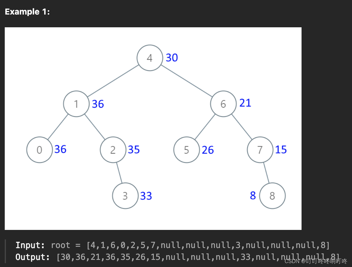 注意二叉树是有序的,根据例子,是进行了右中左的顺序累加的。所以也就是以右中左的顺序遍历二叉树就好。感觉把二叉树的搜索顺序搞清楚后,解题代码就比较模版化了。回头可以再好好复习一下二叉树的搜索。