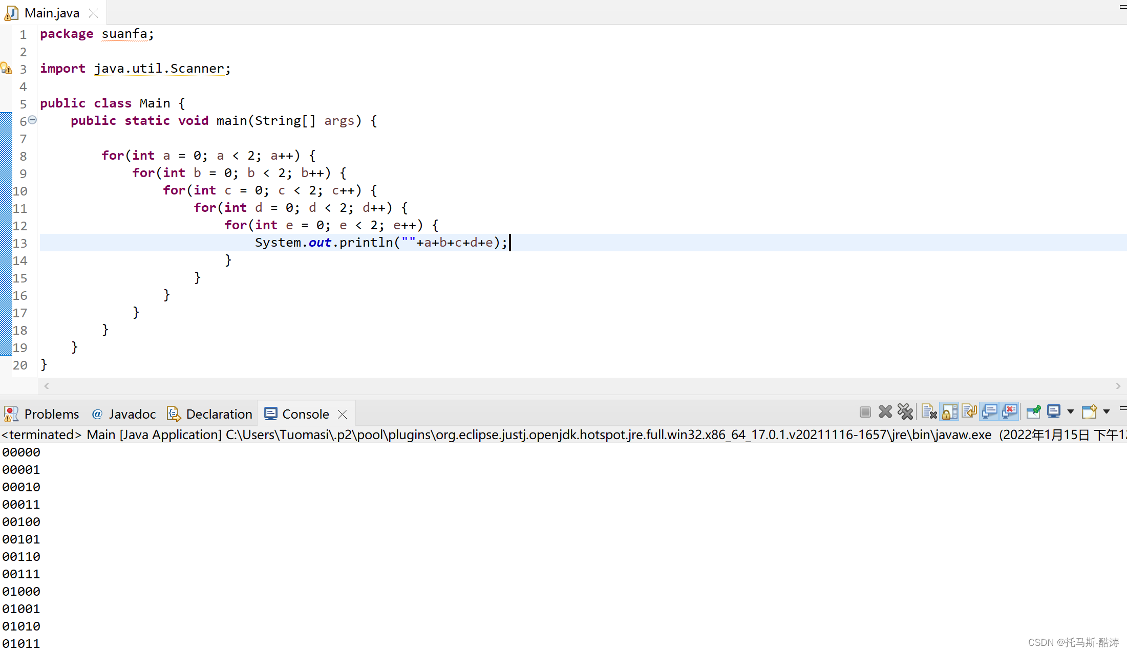 输出32行,按从小到大的顺序每行一个长度为5的01串。