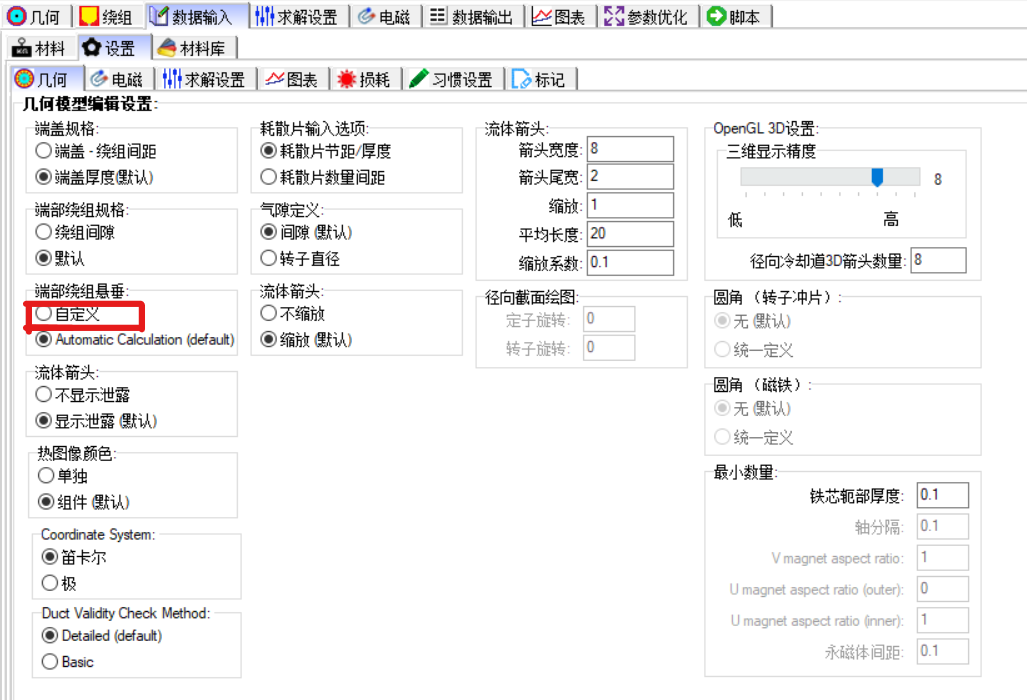设置轴向参数,把定子、转子、永磁体铁芯长度都改成maxwell中的电机长度。motorCAD中的这个电机长度只需要比铁心长+端部绕组前长+端部绕组后长+转轴伸出前长+转轴伸出后长更长就可以了,端部绕组前后长、转轴伸出前后长和端部绕组垂悬可以看情况调整。如果参数栏没有端部绕组垂悬,只有EWdg OH Mult [F]、[R],可以在数据输入-设置-几何中把端部绕组垂悬的设置改成自定义。