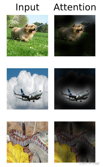 论文在图上标出了注意力机制注意到的东西,我理解的论文写的标注方法是:先计算每一层所有heads的平均的attention weights,再把每一层的平均attention weights乘起来,最后乘以patches再拼起来。从图上可以看出注意力机制真的注意到了图上与分类有关的东西: