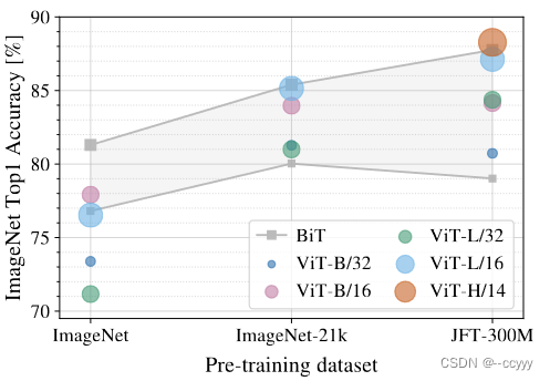 还有就是随着模型变大,ViT的性能并没有要饱和的意思,也就是模型再大它还能更好。(其实图中的ResNet也是没有饱和的迹象)