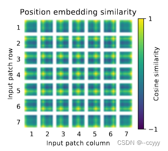 论文还计算了每个postional embedding之间的相似性,从图中可以看出:在相同行 / 列的patches的positional embeddings是相似的: