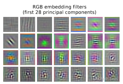 论文画出了ViT最前面对patches做embedding时的线性矩阵,看起来跟CNN的卷积核很像,确实学到了一些纹理之类的东西: